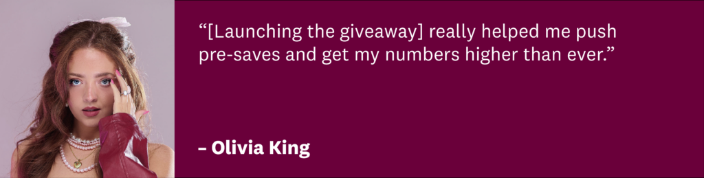 Olivia set up an automated chat flow to automatically send a pre-save link to fans who commented “Grace” on any of her social media posts. Fans who commented were then entered to win a mystery box from Olivia.