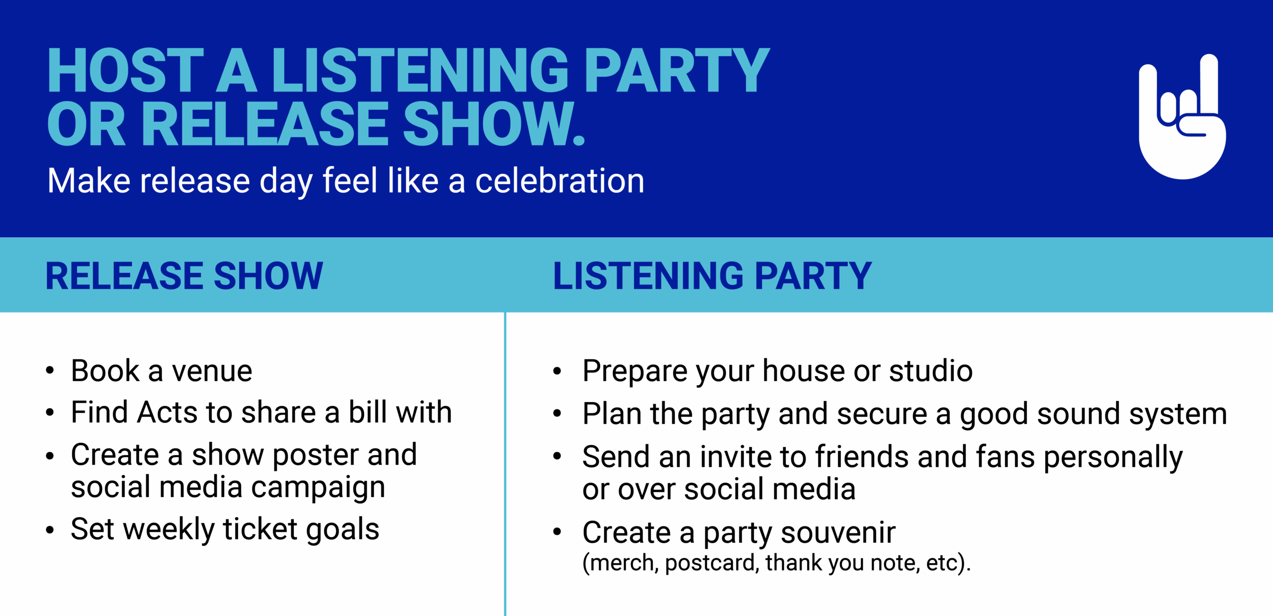 Your release day is a celebration, so make it feel like one. Hosting a listening party or booking a release show gives fans a shared moment to experience your new music together. You’ll need to approach a release show differently from a listening party—additional guidance below.