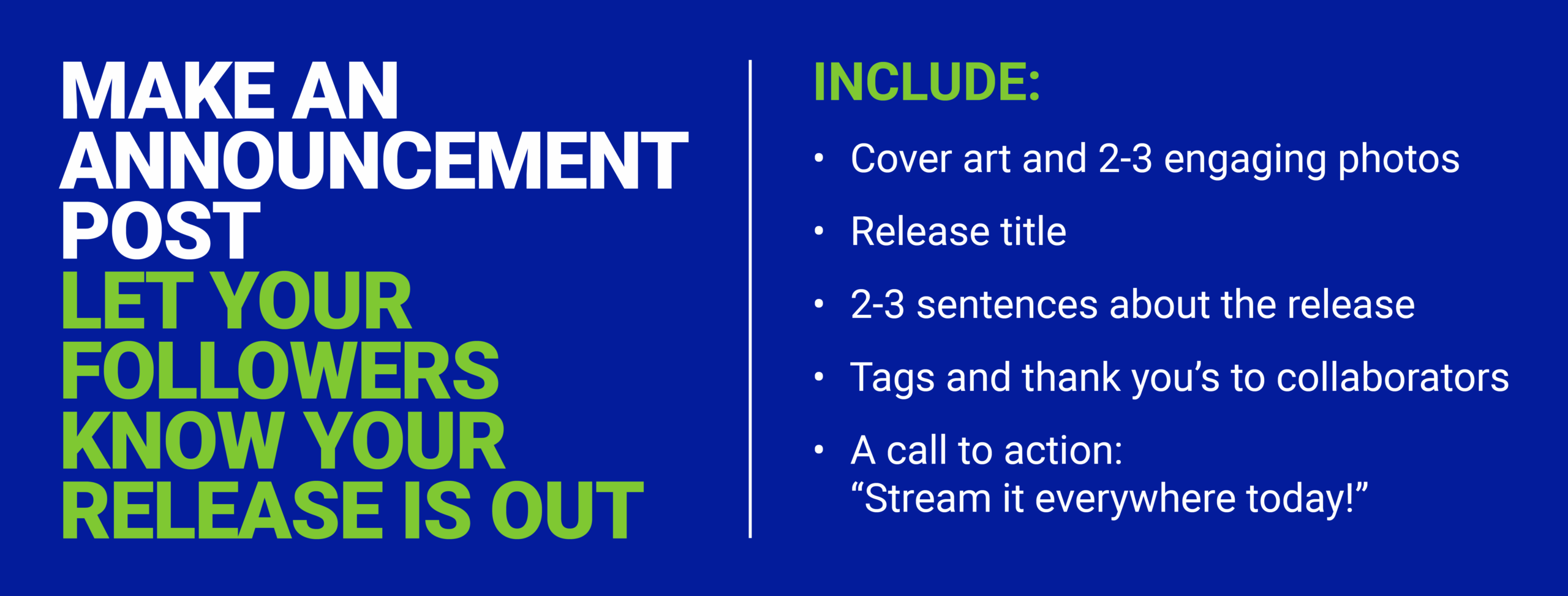 Let everyone know your release is officially live. Post across your social platforms and use the caption to thank and tag collaborators, share a short story behind the release, and call on fans to listen. Mix in behind-the-scenes or live photos alongside your cover art to boost engagement.