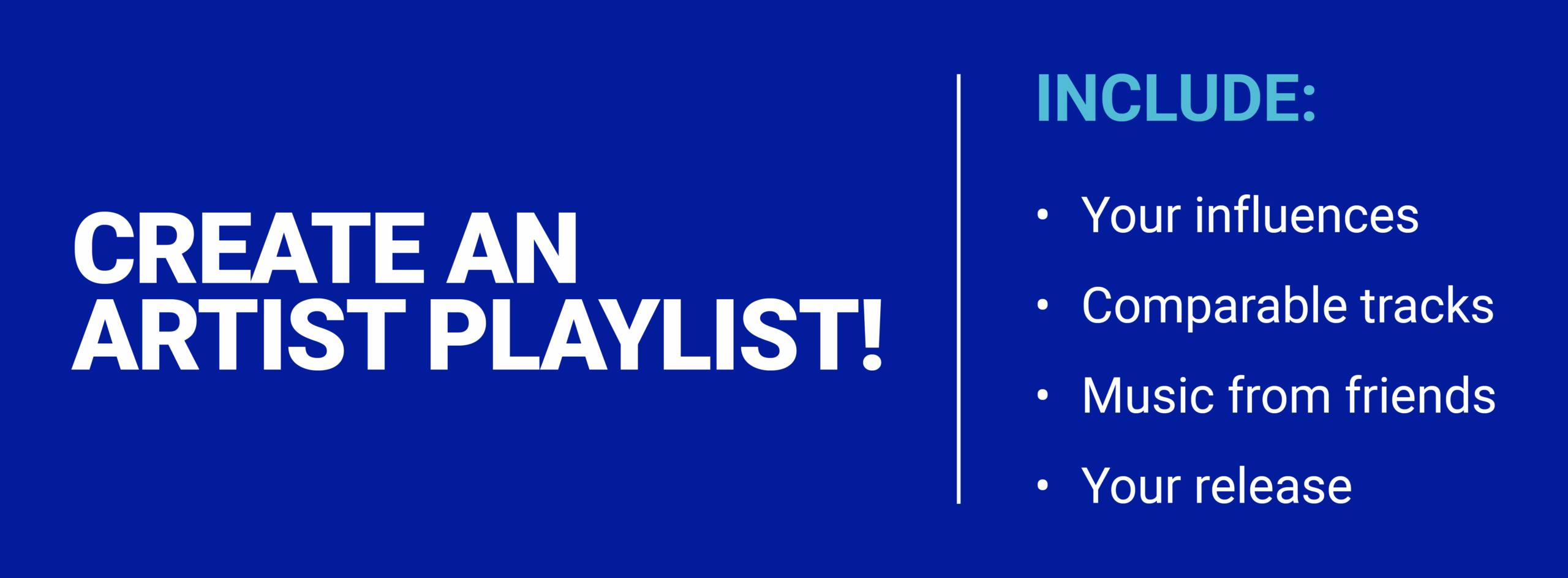 Your fans might be wondering what you’re listening to or what influences and friends shaped your latest release. Let them know by creating an official artist playlist of your new songs mixed in with songs of your choosing! Promote your playlist over socials and encourage fans to follow or save the playlist and continue to update it with every new release.