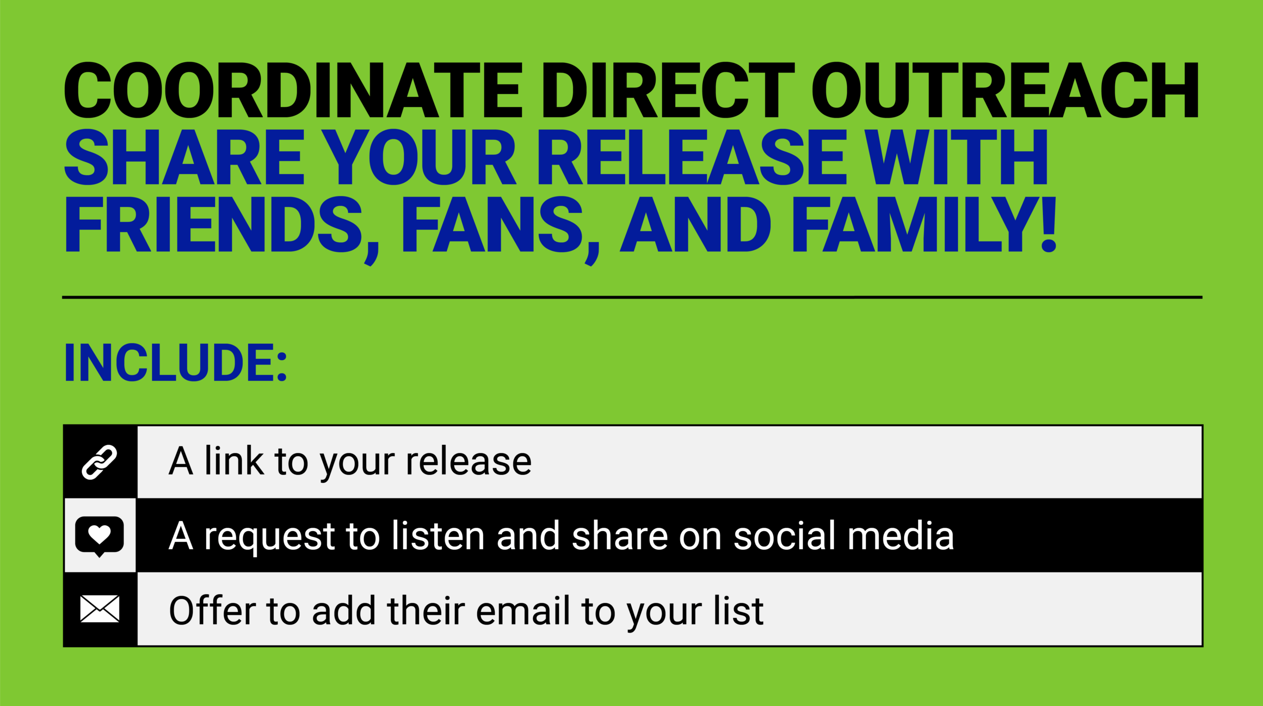 Message friends, family, and fans with a link to your latest release. It’s a great way to keep your network warm and let people know you’re active.